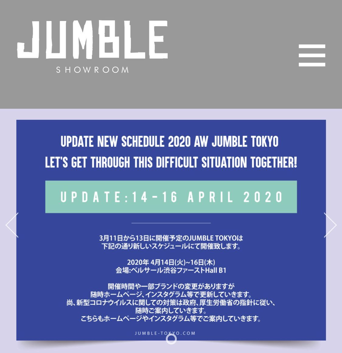 「楽天ファッションウィーク東京」の中止が3月2日に発表され、それ以降、スパイラルホールで開かれた「マグ」とベルサール渋谷ザ・ガーデンで開催された「ジタック」以外の合同展が軒並み中止となった。「ジャンブル」(※4月に延期)、「プラグイン」「PR01トレードショー」「パサージュ」「ファッションワールド」などは主催者の判断により、開催を見合わせた。ここまでは、各主催者の判断による訳だが、あくまで自粛要請なので、政府にその賠償責任はなく、主催者の損害となる。